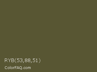 RYB 53,88,51 Color is a dark yellow color and the nearest color is Verdigris #5d5e37. Hex code #585633 and RGB value is rgb(88,86,51). In RGB color space, this color is composed of 35% red, 34% green, 20% blue, In CMYK color space, this color is composed of 0% cyan, 2% magenta, 42% yellow , 65% black , In HSL color space, this color has a hue angle of 57° , 27% saturation and 27% lightness.