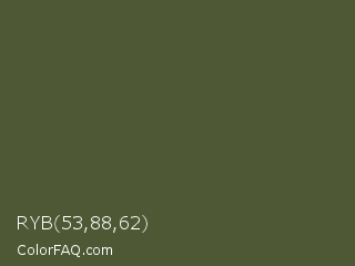 RYB 53,88,62 Color is a dark lime color and the nearest color is Woodland #4d5328. Hex code #4f5835 and RGB value is rgb(79,88,53). In RGB color space, this color is composed of 31% red, 35% green, 21% blue, In CMYK color space, this color is composed of 10% cyan, 0% magenta, 40% yellow , 65% black , In HSL color space, this color has a hue angle of 75° , 25% saturation and 28% lightness.