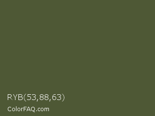 RYB 53,88,63 Color is a dark lime color and the nearest color is Woodland #4d5328. Hex code #4e5835 and RGB value is rgb(78,88,53). In RGB color space, this color is composed of 31% red, 35% green, 21% blue, In CMYK color space, this color is composed of 11% cyan, 0% magenta, 40% yellow , 65% black , In HSL color space, this color has a hue angle of 77° , 25% saturation and 28% lightness.