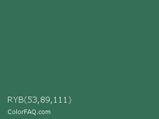 RYB 53,89,111 Color is a normal green color and the nearest color is Amazon #3b7a57. Hex code #356f58 and RGB value is rgb(53,111,88). In RGB color space, this color is composed of 21% red, 44% green, 35% blue, In CMYK color space, this color is composed of 52% cyan, 0% magenta, 21% yellow , 56% black , In HSL color space, this color has a hue angle of 156° , 35% saturation and 32% lightness.