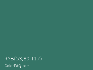 RYB 53,89,117 Color is a normal cyan color and the nearest color is Myrtle Green #317873. Hex code #357567 and RGB value is rgb(53,117,103). In RGB color space, this color is composed of 21% red, 46% green, 40% blue, In CMYK color space, this color is composed of 55% cyan, 0% magenta, 12% yellow , 54% black , In HSL color space, this color has a hue angle of 167° , 38% saturation and 33% lightness.