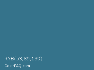RYB 53,89,139 Color is a normal blue color and the nearest color is Teal Blue #367588. Hex code #35738b and RGB value is rgb(53,115,139). In RGB color space, this color is composed of 21% red, 45% green, 55% blue, In CMYK color space, this color is composed of 62% cyan, 17% magenta, 0% yellow , 45% black , In HSL color space, this color has a hue angle of 197° , 45% saturation and 38% lightness.