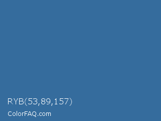RYB 53,89,157 Color is a normal blue color and the nearest color is Queen Blue #436b95. Hex code #356c9d and RGB value is rgb(53,108,157). In RGB color space, this color is composed of 21% red, 42% green, 62% blue, In CMYK color space, this color is composed of 66% cyan, 31% magenta, 0% yellow , 38% black , In HSL color space, this color has a hue angle of 208° , 50% saturation and 41% lightness.