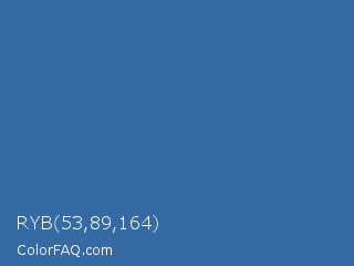 RYB 53,89,164 Color is a normal blue color and the nearest color is Azure #315ba1. Hex code #356aa4 and RGB value is rgb(53,106,164). In RGB color space, this color is composed of 21% red, 42% green, 64% blue, In CMYK color space, this color is composed of 68% cyan, 35% magenta, 0% yellow , 36% black , In HSL color space, this color has a hue angle of 211° , 51% saturation and 43% lightness.