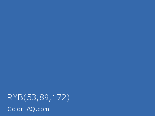 RYB 53,89,172 Color is a normal blue color and the nearest color is San Marino #456cac. Hex code #3569ac and RGB value is rgb(53,105,172). In RGB color space, this color is composed of 21% red, 41% green, 67% blue, In CMYK color space, this color is composed of 69% cyan, 39% magenta, 0% yellow , 33% black , In HSL color space, this color has a hue angle of 214° , 53% saturation and 44% lightness.