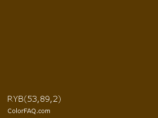 RYB 53,89,2 Color is a very dark orange color and the nearest color is Saddle Brown #583401. Hex code #593902 and RGB value is rgb(89,57,2). In RGB color space, this color is composed of 35% red, 22% green, 1% blue, In CMYK color space, this color is composed of 0% cyan, 36% magenta, 98% yellow , 65% black , In HSL color space, this color has a hue angle of 38° , 96% saturation and 18% lightness.