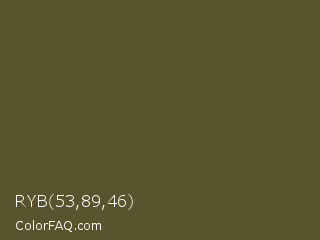 RYB 53,89,46 Color is a dark yellow color and the nearest color is Costa Del Sol #615d30. Hex code #59532e and RGB value is rgb(89,83,46). In RGB color space, this color is composed of 35% red, 33% green, 18% blue, In CMYK color space, this color is composed of 0% cyan, 7% magenta, 48% yellow , 65% black , In HSL color space, this color has a hue angle of 52° , 32% saturation and 26% lightness.