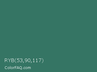 RYB 53,90,117 Color is a normal cyan color and the nearest color is Amazon #3b7a57. Hex code #357564 and RGB value is rgb(53,117,100). In RGB color space, this color is composed of 21% red, 46% green, 39% blue, In CMYK color space, this color is composed of 55% cyan, 0% magenta, 15% yellow , 54% black , In HSL color space, this color has a hue angle of 164° , 38% saturation and 33% lightness.