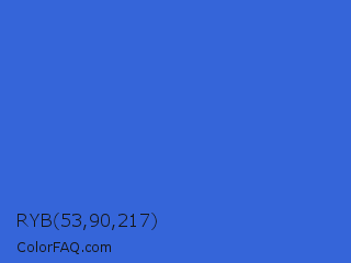 RYB 53,90,217 Color is a normal blue color and the nearest color is Royal Blue #4169e1. Hex code #3565d9 and RGB value is rgb(53,101,217). In RGB color space, this color is composed of 21% red, 40% green, 85% blue, In CMYK color space, this color is composed of 76% cyan, 53% magenta, 0% yellow , 15% black , In HSL color space, this color has a hue angle of 222° , 68% saturation and 53% lightness.