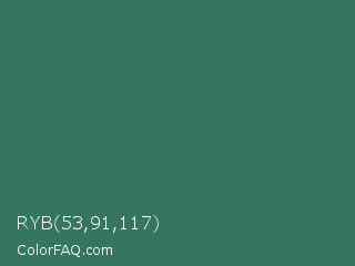 RYB 53,91,117 Color is a normal green color and the nearest color is Amazon #3b7a57. Hex code #357561 and RGB value is rgb(53,117,97). In RGB color space, this color is composed of 21% red, 46% green, 38% blue, In CMYK color space, this color is composed of 55% cyan, 0% magenta, 17% yellow , 54% black , In HSL color space, this color has a hue angle of 161° , 38% saturation and 33% lightness.