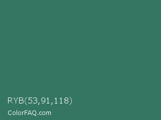 RYB 53,91,118 Color is a normal green color and the nearest color is Amazon #3b7a57. Hex code #357663 and RGB value is rgb(53,118,99). In RGB color space, this color is composed of 21% red, 46% green, 39% blue, In CMYK color space, this color is composed of 55% cyan, 0% magenta, 16% yellow , 54% black , In HSL color space, this color has a hue angle of 162° , 38% saturation and 34% lightness.