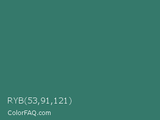 RYB 53,91,121 Color is a normal cyan color and the nearest color is Myrtle Green #317873. Hex code #35796b and RGB value is rgb(53,121,107). In RGB color space, this color is composed of 21% red, 47% green, 42% blue, In CMYK color space, this color is composed of 56% cyan, 0% magenta, 12% yellow , 53% black , In HSL color space, this color has a hue angle of 168° , 39% saturation and 34% lightness.