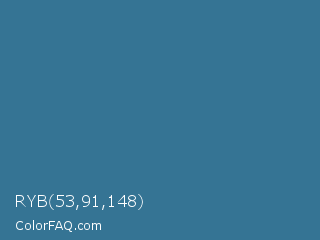 RYB 53,91,148 Color is a normal blue color and the nearest color is Calypso #31728d. Hex code #357494 and RGB value is rgb(53,116,148). In RGB color space, this color is composed of 21% red, 45% green, 58% blue, In CMYK color space, this color is composed of 64% cyan, 22% magenta, 0% yellow , 42% black , In HSL color space, this color has a hue angle of 200° , 47% saturation and 39% lightness.