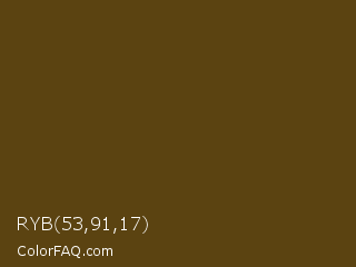 RYB 53,91,17 Color is a very dark orange color and the nearest color is Horses Neck #604913. Hex code #5b4311 and RGB value is rgb(91,67,17). In RGB color space, this color is composed of 36% red, 26% green, 7% blue, In CMYK color space, this color is composed of 0% cyan, 26% magenta, 81% yellow , 64% black , In HSL color space, this color has a hue angle of 41° , 69% saturation and 21% lightness.