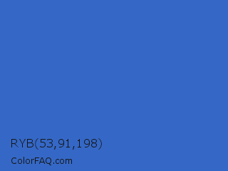 RYB 53,91,198 Color is a normal blue color and the nearest color is Mariner #286acd. Hex code #3568c6 and RGB value is rgb(53,104,198). In RGB color space, this color is composed of 21% red, 41% green, 78% blue, In CMYK color space, this color is composed of 73% cyan, 47% magenta, 0% yellow , 22% black , In HSL color space, this color has a hue angle of 219° , 58% saturation and 49% lightness.