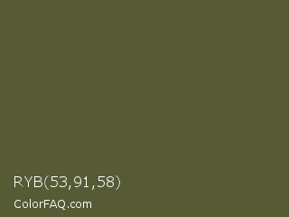 RYB 53,91,58 Color is a dark yellow color and the nearest color is Verdigris #5d5e37. Hex code #565b35 and RGB value is rgb(86,91,53). In RGB color space, this color is composed of 34% red, 36% green, 21% blue, In CMYK color space, this color is composed of 5% cyan, 0% magenta, 42% yellow , 64% black , In HSL color space, this color has a hue angle of 68° , 26% saturation and 28% lightness.
