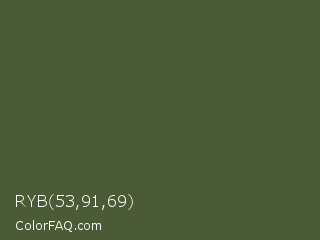 RYB 53,91,69 Color is a dark green color and the nearest color is Tom Thumb #3f583b. Hex code #4b5b35 and RGB value is rgb(75,91,53). In RGB color space, this color is composed of 29% red, 36% green, 21% blue, In CMYK color space, this color is composed of 18% cyan, 0% magenta, 42% yellow , 64% black , In HSL color space, this color has a hue angle of 85° , 26% saturation and 28% lightness.