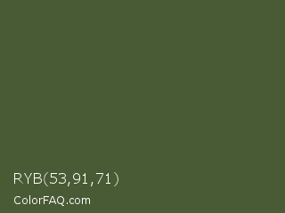 RYB 53,91,71 Color is a dark green color and the nearest color is Tom Thumb #3f583b. Hex code #495b35 and RGB value is rgb(73,91,53). In RGB color space, this color is composed of 29% red, 36% green, 21% blue, In CMYK color space, this color is composed of 20% cyan, 0% magenta, 42% yellow , 64% black , In HSL color space, this color has a hue angle of 88° , 26% saturation and 28% lightness.