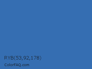RYB 53,92,178 Color is a normal blue color and the nearest color is San Marino #456cac. Hex code #356eb2 and RGB value is rgb(53,110,178). In RGB color space, this color is composed of 21% red, 43% green, 70% blue, In CMYK color space, this color is composed of 70% cyan, 38% magenta, 0% yellow , 30% black , In HSL color space, this color has a hue angle of 213° , 54% saturation and 45% lightness.