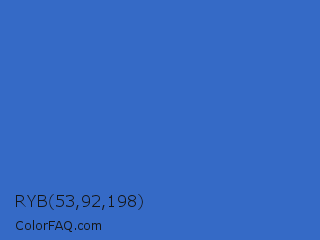 RYB 53,92,198 Color is a normal blue color and the nearest color is Mariner #286acd. Hex code #356ac6 and RGB value is rgb(53,106,198). In RGB color space, this color is composed of 21% red, 42% green, 78% blue, In CMYK color space, this color is composed of 73% cyan, 46% magenta, 0% yellow , 22% black , In HSL color space, this color has a hue angle of 218° , 58% saturation and 49% lightness.