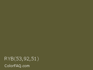 RYB 53,92,51 Color is a dark yellow color and the nearest color is Verdigris #5d5e37. Hex code #5c5a33 and RGB value is rgb(92,90,51). In RGB color space, this color is composed of 36% red, 35% green, 20% blue, In CMYK color space, this color is composed of 0% cyan, 2% magenta, 45% yellow , 64% black , In HSL color space, this color has a hue angle of 57° , 29% saturation and 28% lightness.