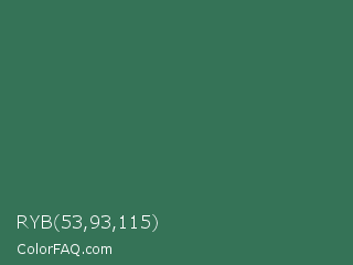 RYB 53,93,115 Color is a normal green color and the nearest color is Amazon #3b7a57. Hex code #357357 and RGB value is rgb(53,115,87). In RGB color space, this color is composed of 21% red, 45% green, 34% blue, In CMYK color space, this color is composed of 54% cyan, 0% magenta, 24% yellow , 55% black , In HSL color space, this color has a hue angle of 153° , 37% saturation and 33% lightness.