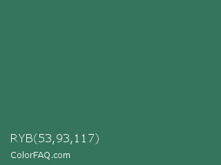 RYB 53,93,117 Color is a normal green color and the nearest color is Amazon #3b7a57. Hex code #35755b and RGB value is rgb(53,117,91). In RGB color space, this color is composed of 21% red, 46% green, 36% blue, In CMYK color space, this color is composed of 55% cyan, 0% magenta, 22% yellow , 54% black , In HSL color space, this color has a hue angle of 156° , 38% saturation and 33% lightness.