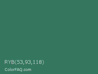 RYB 53,93,118 Color is a normal green color and the nearest color is Amazon #3b7a57. Hex code #35765e and RGB value is rgb(53,118,94). In RGB color space, this color is composed of 21% red, 46% green, 37% blue, In CMYK color space, this color is composed of 55% cyan, 0% magenta, 20% yellow , 54% black , In HSL color space, this color has a hue angle of 158° , 38% saturation and 34% lightness.