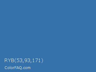 RYB 53,93,171 Color is a normal blue color and the nearest color is Astral #327da0. Hex code #3572ab and RGB value is rgb(53,114,171). In RGB color space, this color is composed of 21% red, 45% green, 67% blue, In CMYK color space, this color is composed of 69% cyan, 33% magenta, 0% yellow , 33% black , In HSL color space, this color has a hue angle of 209° , 53% saturation and 44% lightness.