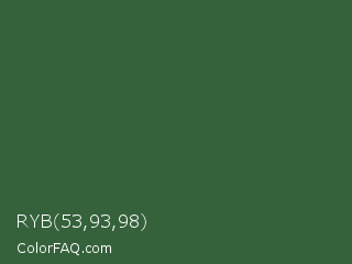 RYB 53,93,98 Color is a dark green color and the nearest color is Hunter Green #355e3b. Hex code #35623b and RGB value is rgb(53,98,59). In RGB color space, this color is composed of 21% red, 38% green, 23% blue, In CMYK color space, this color is composed of 46% cyan, 0% magenta, 40% yellow , 62% black , In HSL color space, this color has a hue angle of 128° , 30% saturation and 30% lightness.