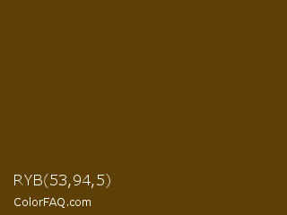 RYB 53,94,5 Color is a very dark orange color and the nearest color is Pineapple #563c0d. Hex code #5e3f05 and RGB value is rgb(94,63,5). In RGB color space, this color is composed of 37% red, 25% green, 2% blue, In CMYK color space, this color is composed of 0% cyan, 33% magenta, 95% yellow , 63% black , In HSL color space, this color has a hue angle of 39° , 90% saturation and 19% lightness.
