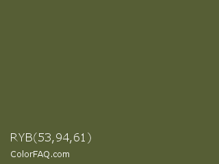 RYB 53,94,61 Color is a dark lime color and the nearest color is Verdigris #5d5e37. Hex code #565e35 and RGB value is rgb(86,94,53). In RGB color space, this color is composed of 34% red, 37% green, 21% blue, In CMYK color space, this color is composed of 9% cyan, 0% magenta, 44% yellow , 63% black , In HSL color space, this color has a hue angle of 72° , 28% saturation and 29% lightness.