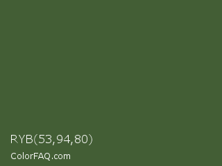 RYB 53,94,80 Color is a dark green color and the nearest color is Tom Thumb #3f583b. Hex code #435e35 and RGB value is rgb(67,94,53). In RGB color space, this color is composed of 26% red, 37% green, 21% blue, In CMYK color space, this color is composed of 29% cyan, 0% magenta, 44% yellow , 63% black , In HSL color space, this color has a hue angle of 100° , 28% saturation and 29% lightness.