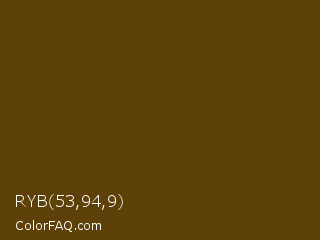 RYB 53,94,9 Color is a very dark orange color and the nearest color is Pineapple #563c0d. Hex code #5e4109 and RGB value is rgb(94,65,9). In RGB color space, this color is composed of 37% red, 25% green, 4% blue, In CMYK color space, this color is composed of 0% cyan, 31% magenta, 90% yellow , 63% black , In HSL color space, this color has a hue angle of 40° , 83% saturation and 20% lightness.