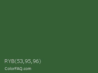 RYB 53,95,96 Color is a dark green color and the nearest color is Hunter Green #355e3b. Hex code #356036 and RGB value is rgb(53,96,54). In RGB color space, this color is composed of 21% red, 38% green, 21% blue, In CMYK color space, this color is composed of 45% cyan, 0% magenta, 44% yellow , 62% black , In HSL color space, this color has a hue angle of 121° , 29% saturation and 29% lightness.