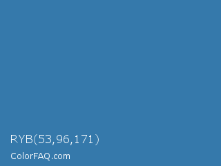 RYB 53,96,171 Color is a normal blue color and the nearest color is Astral #327da0. Hex code #3579ab and RGB value is rgb(53,121,171). In RGB color space, this color is composed of 21% red, 47% green, 67% blue, In CMYK color space, this color is composed of 69% cyan, 29% magenta, 0% yellow , 33% black , In HSL color space, this color has a hue angle of 205° , 53% saturation and 44% lightness.