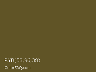 RYB 53,96,38 Color is a dark yellow color and the nearest color is Donkey Brown #664c28. Hex code #605426 and RGB value is rgb(96,84,38). In RGB color space, this color is composed of 38% red, 33% green, 15% blue, In CMYK color space, this color is composed of 0% cyan, 13% magenta, 60% yellow , 62% black , In HSL color space, this color has a hue angle of 48° , 43% saturation and 26% lightness.