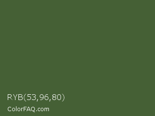 RYB 53,96,80 Color is a dark green color and the nearest color is Tom Thumb #3f583b. Hex code #456035 and RGB value is rgb(69,96,53). In RGB color space, this color is composed of 27% red, 38% green, 21% blue, In CMYK color space, this color is composed of 28% cyan, 0% magenta, 45% yellow , 62% black , In HSL color space, this color has a hue angle of 98° , 29% saturation and 29% lightness.