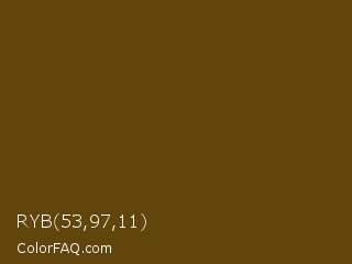 RYB 53,97,11 Color is a very dark orange color and the nearest color is Horses Neck #604913. Hex code #61450b and RGB value is rgb(97,69,11). In RGB color space, this color is composed of 38% red, 27% green, 4% blue, In CMYK color space, this color is composed of 0% cyan, 29% magenta, 89% yellow , 62% black , In HSL color space, this color has a hue angle of 40° , 80% saturation and 21% lightness.
