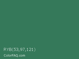 RYB 53,97,121 Color is a normal green color and the nearest color is Amazon #3b7a57. Hex code #35795a and RGB value is rgb(53,121,90). In RGB color space, this color is composed of 21% red, 47% green, 35% blue, In CMYK color space, this color is composed of 56% cyan, 0% magenta, 26% yellow , 53% black , In HSL color space, this color has a hue angle of 153° , 39% saturation and 34% lightness.