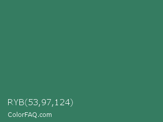 RYB 53,97,124 Color is a normal green color and the nearest color is Amazon #3b7a57. Hex code #357c61 and RGB value is rgb(53,124,97). In RGB color space, this color is composed of 21% red, 49% green, 38% blue, In CMYK color space, this color is composed of 57% cyan, 0% magenta, 22% yellow , 51% black , In HSL color space, this color has a hue angle of 157° , 40% saturation and 35% lightness.