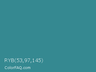 RYB 53,97,145 Color is a normal cyan color and the nearest color is Lochinvar #2c8c84. Hex code #358991 and RGB value is rgb(53,137,145). In RGB color space, this color is composed of 21% red, 54% green, 57% blue, In CMYK color space, this color is composed of 63% cyan, 6% magenta, 0% yellow , 43% black , In HSL color space, this color has a hue angle of 185° , 46% saturation and 39% lightness.
