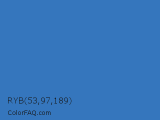 RYB 53,97,189 Color is a normal blue color and the nearest color is Cyan Blue Azure #4682bf. Hex code #3576bd and RGB value is rgb(53,118,189). In RGB color space, this color is composed of 21% red, 46% green, 74% blue, In CMYK color space, this color is composed of 72% cyan, 38% magenta, 0% yellow , 26% black , In HSL color space, this color has a hue angle of 211° , 56% saturation and 47% lightness.