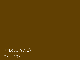 RYB 53,97,2 Color is a very dark orange color and the nearest color is Nutmeg Wood Finish #683600. Hex code #614002 and RGB value is rgb(97,64,2). In RGB color space, this color is composed of 38% red, 25% green, 1% blue, In CMYK color space, this color is composed of 0% cyan, 34% magenta, 98% yellow , 62% black , In HSL color space, this color has a hue angle of 39° , 96% saturation and 19% lightness.