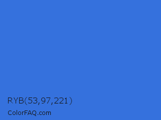 RYB 53,97,221 Color is a normal blue color and the nearest color is Royal Blue #4169e1. Hex code #3571dd and RGB value is rgb(53,113,221). In RGB color space, this color is composed of 21% red, 44% green, 87% blue, In CMYK color space, this color is composed of 76% cyan, 49% magenta, 0% yellow , 13% black , In HSL color space, this color has a hue angle of 219° , 71% saturation and 54% lightness.