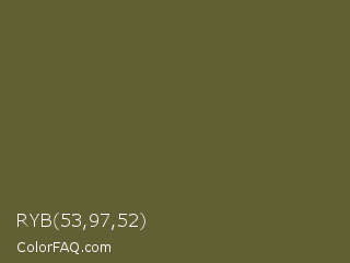 RYB 53,97,52 Color is a dark yellow color and the nearest color is Costa Del Sol #615d30. Hex code #616034 and RGB value is rgb(97,96,52). In RGB color space, this color is composed of 38% red, 38% green, 20% blue, In CMYK color space, this color is composed of 0% cyan, 1% magenta, 46% yellow , 62% black , In HSL color space, this color has a hue angle of 59° , 30% saturation and 29% lightness.