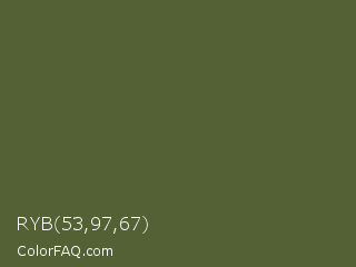 RYB 53,97,67 Color is a dark lime color and the nearest color is Verdigris #5d5e37. Hex code #536135 and RGB value is rgb(83,97,53). In RGB color space, this color is composed of 33% red, 38% green, 21% blue, In CMYK color space, this color is composed of 14% cyan, 0% magenta, 45% yellow , 62% black , In HSL color space, this color has a hue angle of 79° , 29% saturation and 29% lightness.