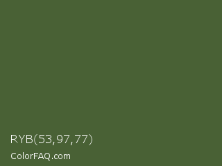 RYB 53,97,77 Color is a dark green color and the nearest color is Tom Thumb #3f583b. Hex code #496135 and RGB value is rgb(73,97,53). In RGB color space, this color is composed of 29% red, 38% green, 21% blue, In CMYK color space, this color is composed of 25% cyan, 0% magenta, 45% yellow , 62% black , In HSL color space, this color has a hue angle of 93° , 29% saturation and 29% lightness.
