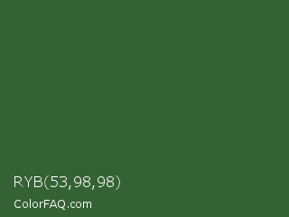 RYB 53,98,98 Color is a dark green color and the nearest color is Hunter Green #355e3b. Hex code #356235 and RGB value is rgb(53,98,53). In RGB color space, this color is composed of 21% red, 38% green, 21% blue, In CMYK color space, this color is composed of 46% cyan, 0% magenta, 46% yellow , 62% black , In HSL color space, this color has a hue angle of 120° , 30% saturation and 30% lightness.