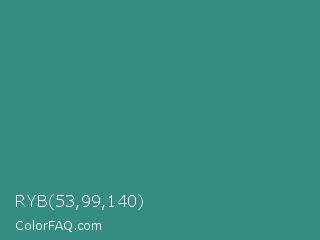 RYB 53,99,140 Color is a normal cyan color and the nearest color is Lochinvar #2c8c84. Hex code #358c83 and RGB value is rgb(53,140,131). In RGB color space, this color is composed of 21% red, 55% green, 51% blue, In CMYK color space, this color is composed of 62% cyan, 0% magenta, 6% yellow , 45% black , In HSL color space, this color has a hue angle of 174° , 45% saturation and 38% lightness.